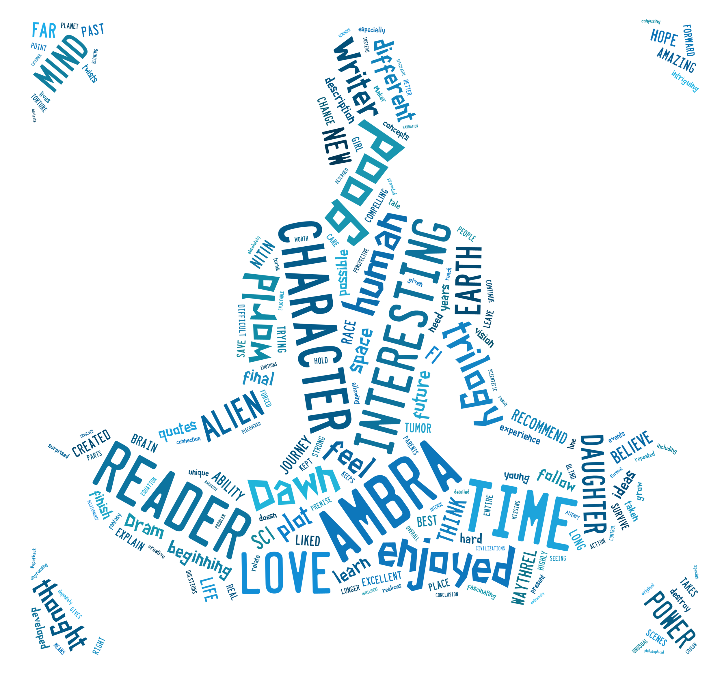 A "word cloud" constructed from all the Amazon reviews of the "Daughter of Time" books (as of April 2015), removing some uninformative but frequent words ("book", author's name, "writing", "very", etc).